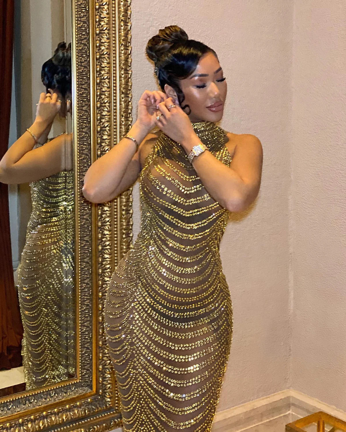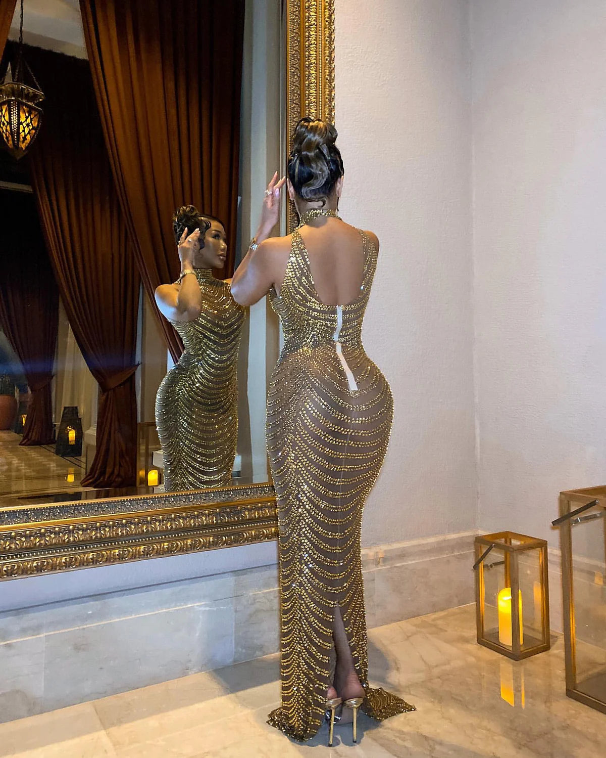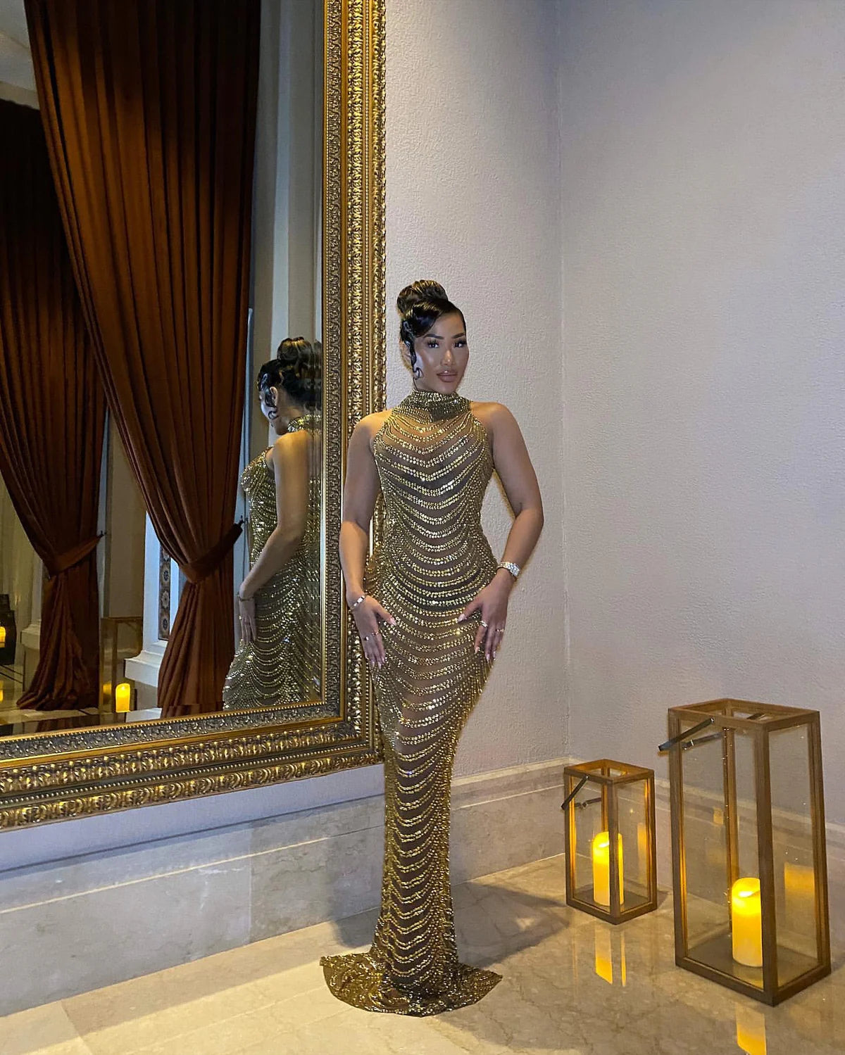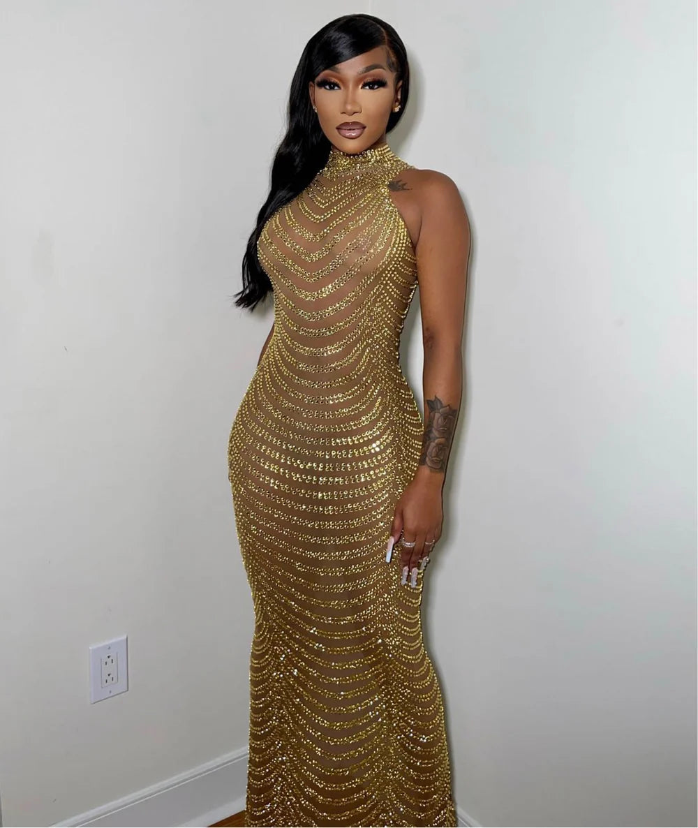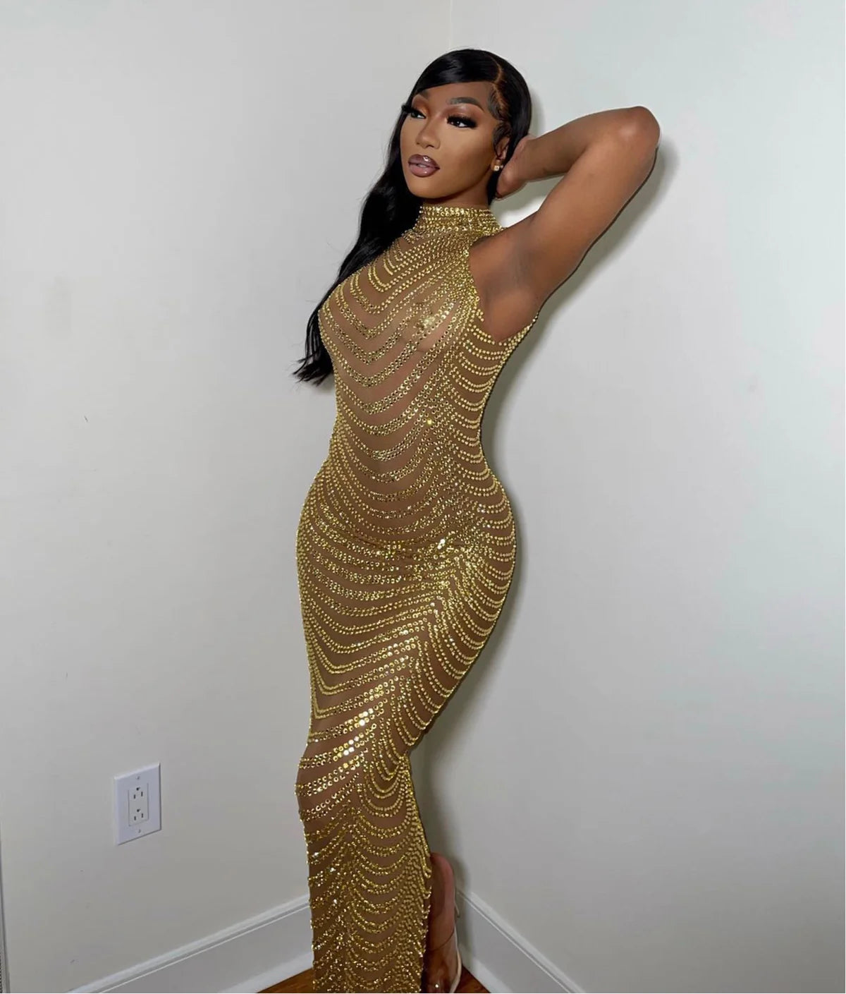 - Make a statement at your next event with this stunning maxi dress. The gold stretchy material is adorned with sparkling rhinestones, while the high neck design exudes a regal feel. This dress is both flattering and form-fitting, and its stretchy fabric ensures a comfortable and true-to-size fit. Get ready to turn heads and make a lasting impression in this dress