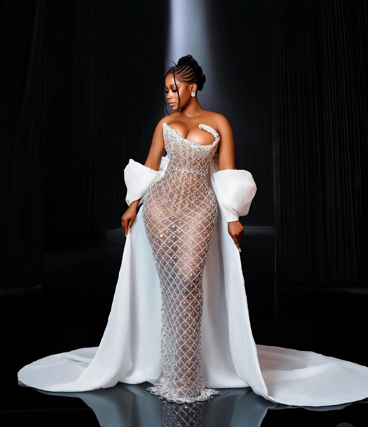 Dress boasts a luxurious and glamorous look with its glittering rhinestones details. A stunning long gown adorned with big gems and rhinestone chains. This stand out piece will make you feel like a true star, adding a touch of glamour and luxury to any special occasion. Shine bright and turn heads with Devotion! All rhinestones placed with professional adhesive.