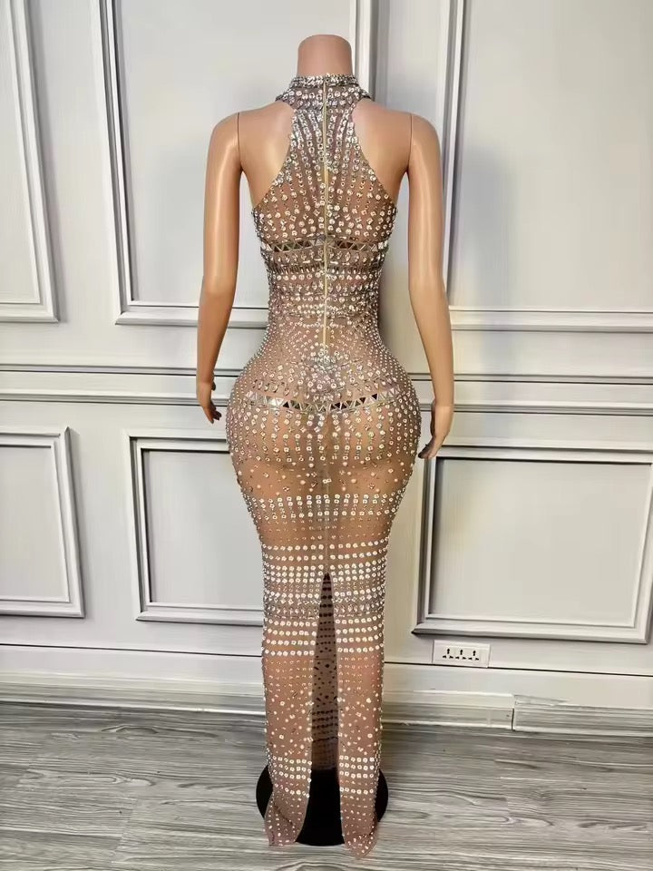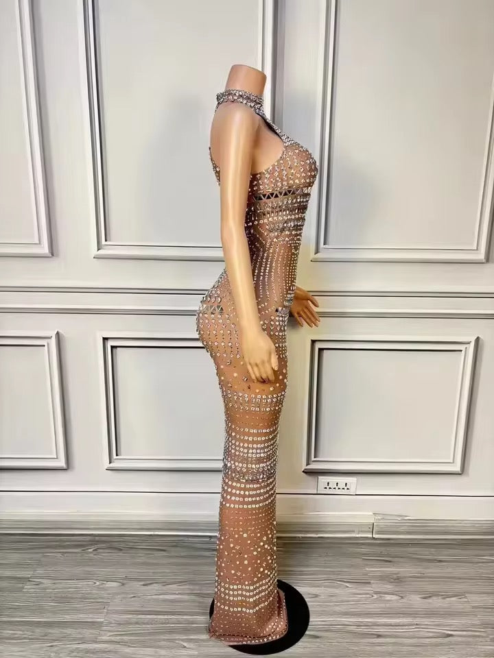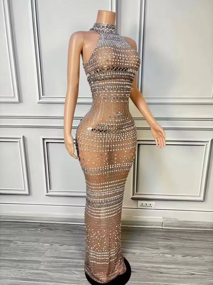 - Make a statement at your next event with this stunning maxi dress. The stretchy material is adorned with sparkling rhinestones, while the high neck design exudes a regal feel. This dress is both flattering and form-fitting, and its stretchy fabric ensures a comfortable and true-to-size fit. Get ready to turn heads and make a lasting impression in this dress