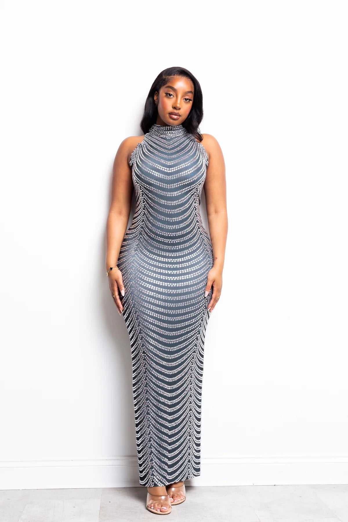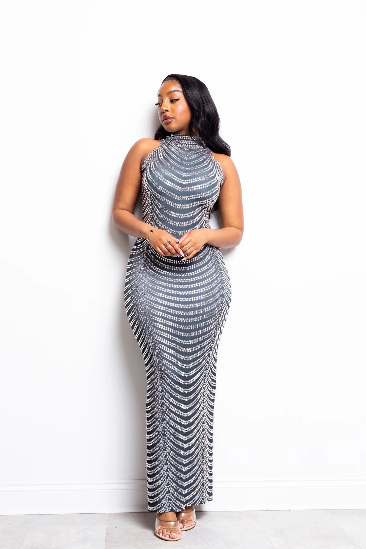 - Make a statement at your next event with this stunning maxi dress. The black stretchy material is adorned with sparkling rhinestones, while the high neck design exudes a regal feel. This dress is both flattering and form-fitting, and its stretchy fabric ensures a comfortable and true-to-size fit. Get ready to turn heads and make a lasting impression in this dress
